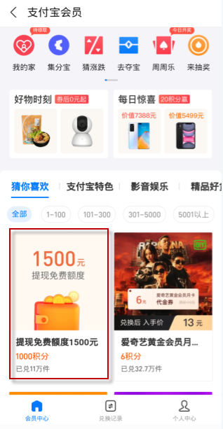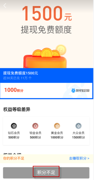 用户可以使用支付宝中的蚂蚁积分进行兑换免费额度,其中兑换为:大众会员1000积分可以兑换1000元免费提现额度;黄金会员1000积分可以兑换1500元的免费提现额度。铂金和钻石会员1000积分可以兑换3000元的免费提现额度。