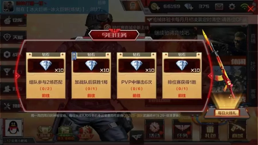 上面这几项,都是每天固定得钻的套路,累积下来基本可以稳定在80个左右的。除此之外,节日活动登录有钻、重要赛事期间登录有钻、版本更新预热登录还是有钻,实在没啥大事了CFM还会自创一个开火趴继续送钻。总之一句话:只要关注,就有钻石。