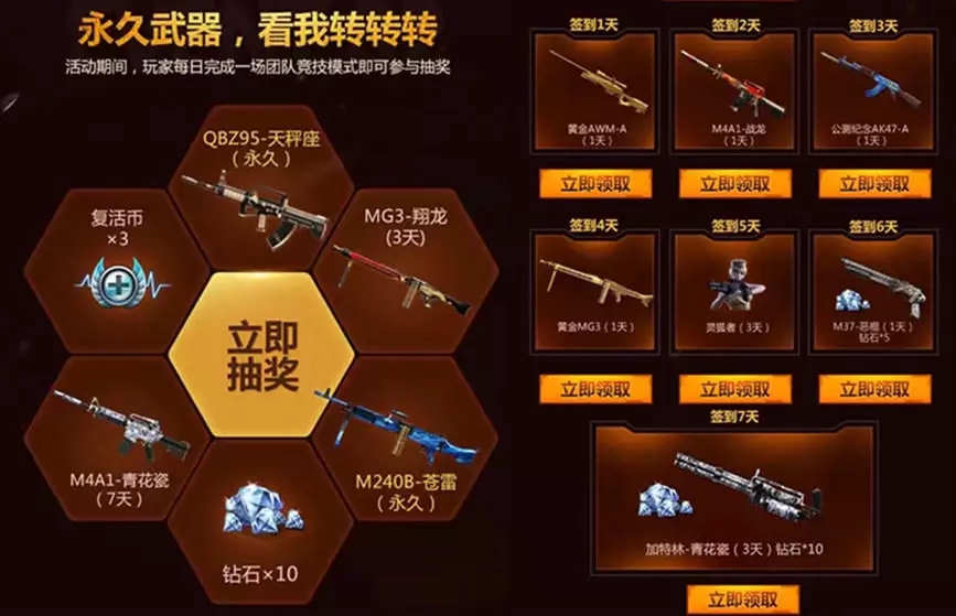 在每天首次登录CFM时,都可以进行签到,第一天可以获得5钻,第七天可以获得50钻,平均下来每天有8钻左右哦。
