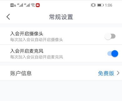 6、常规设置界面,可以选择是否在进入会议后自动开启摄像头或者麦克风。