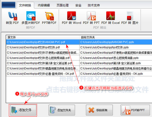 此时看到pdf转换成ppt的操作界面,先点击添加文件按钮选中导入多个pdf文件,文件太多的话可以先把多个pdf文件放到同一个文件夹中,然后点击添加文件夹按钮,将该文件夹内的所有文件导入。鼠标右键点击当前选中的pdf文件可移除该文件,也可以清空列表重新导入。